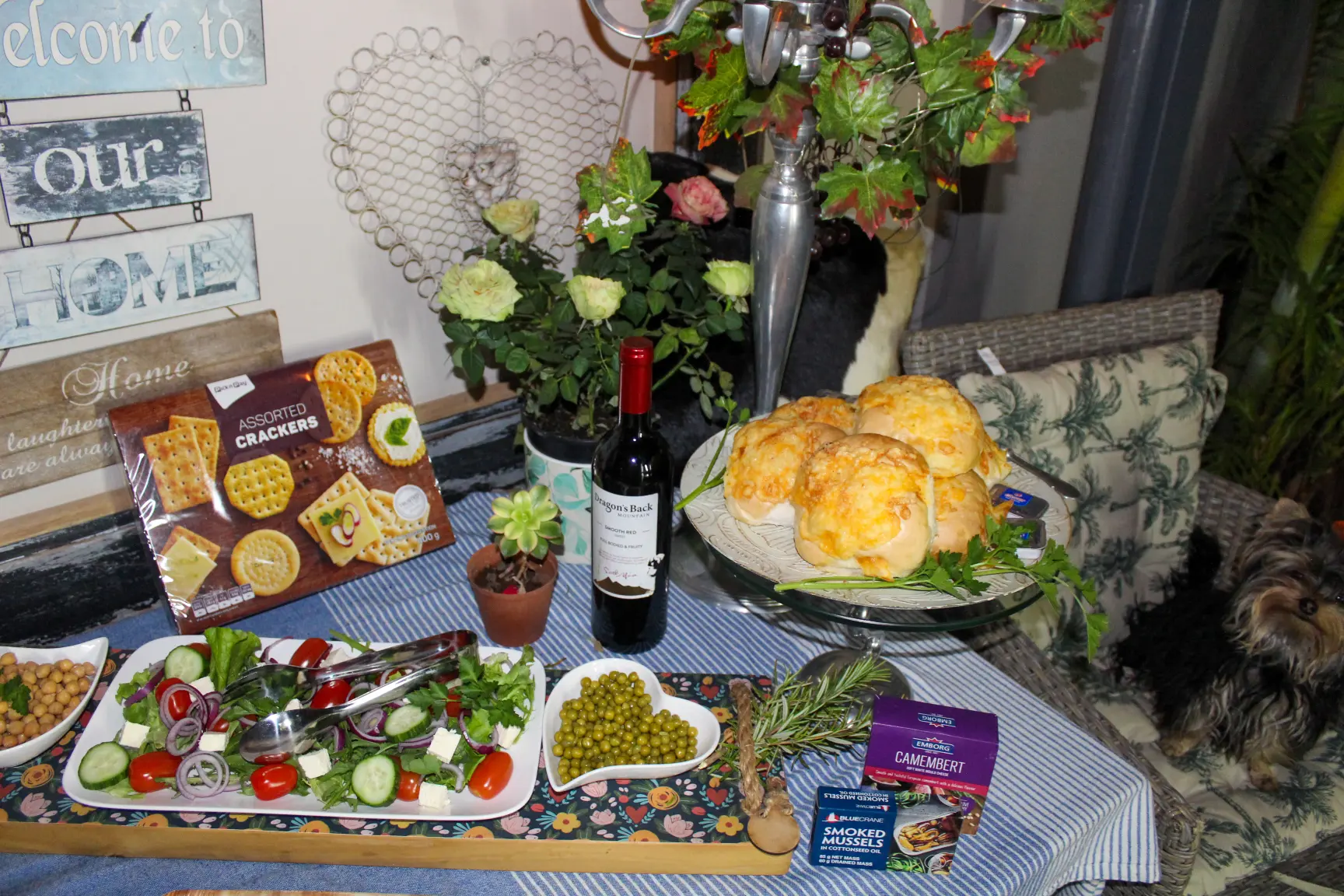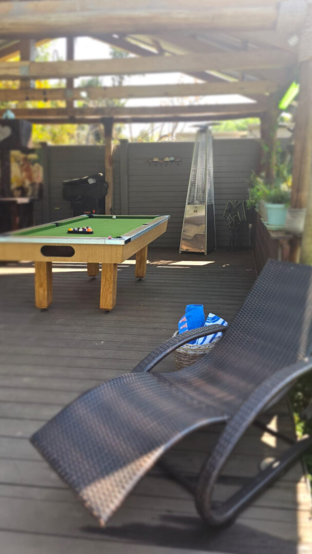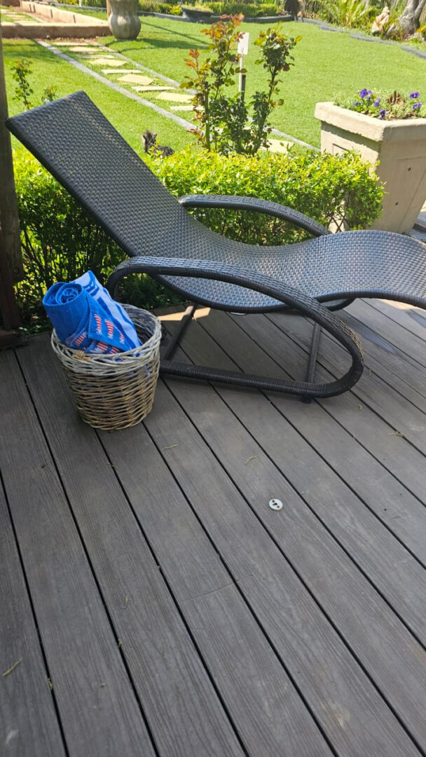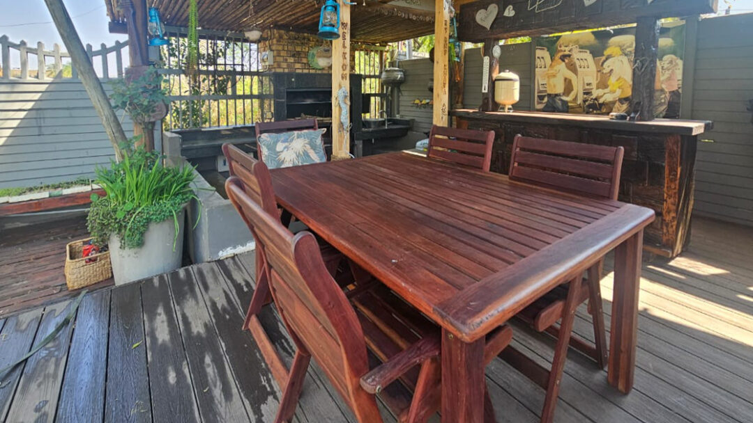 Gas braai, four-seater teak dining set, and a hanging chair for relaxed outdoor meals and gatherings.