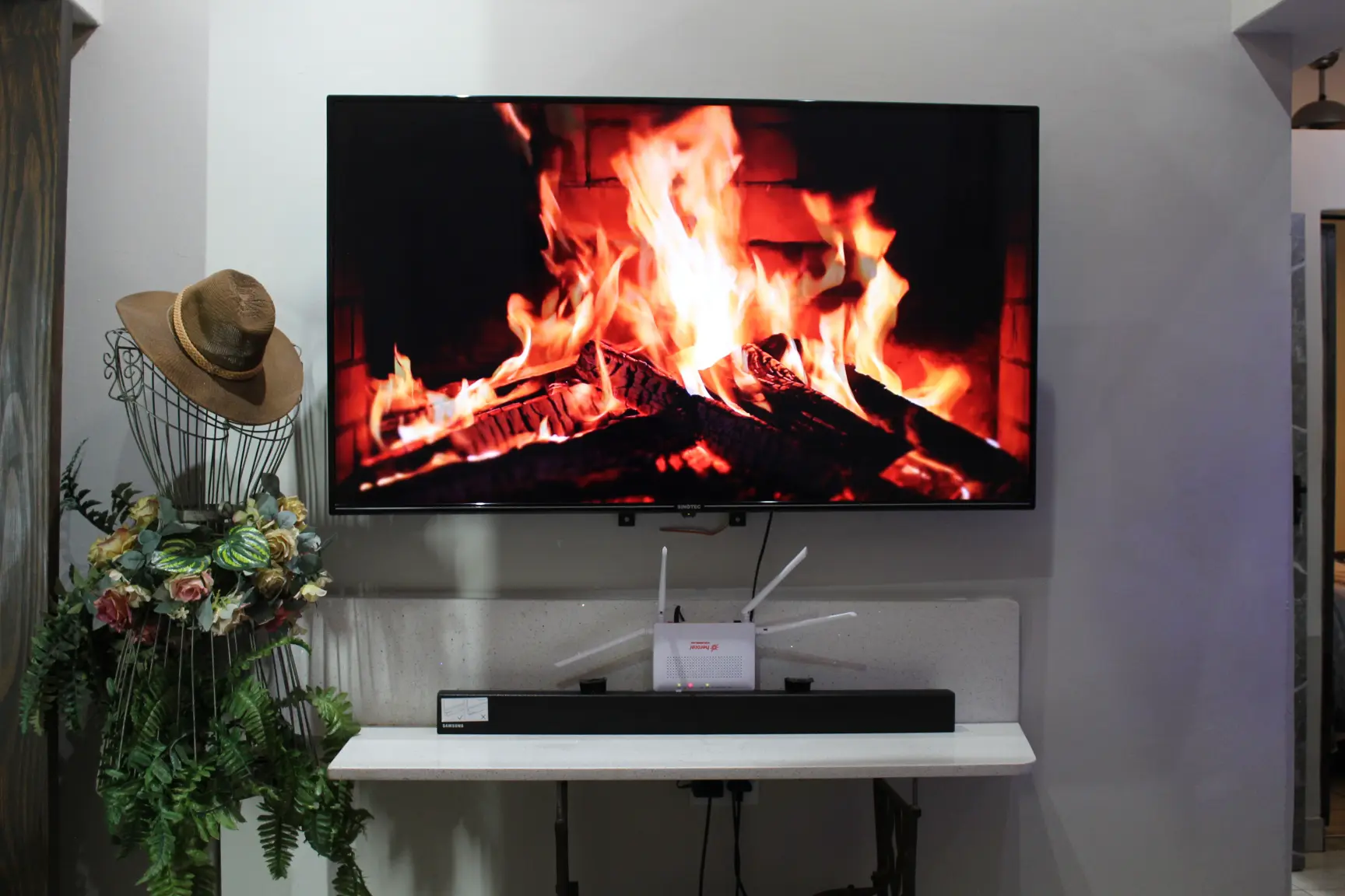 Sleeper couch, Android TV with Netflix and YouTube, free uncapped Wi-Fi, plus a Bluetooth mirror for music.
