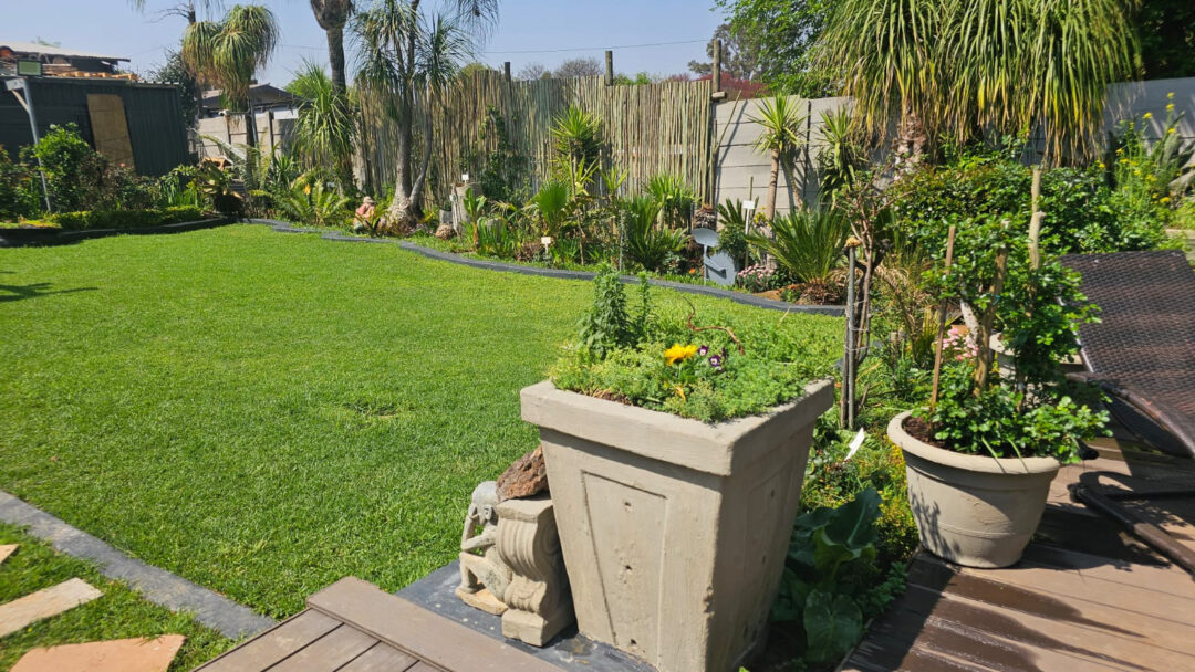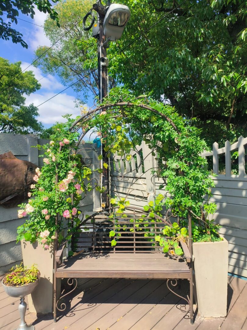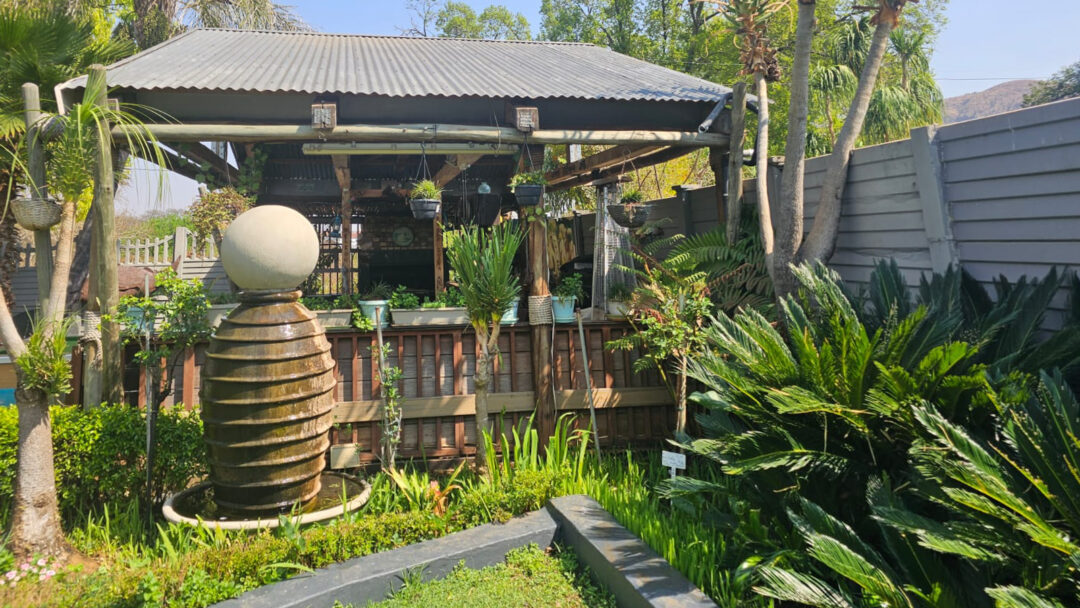 Deck area with a small boma, patio table with chairs, and a lush setting of palm trees, roses, and flowers. Private pedestrian gate for easy access.